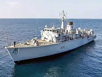 HMS Ledbury, the second ship of the name, is a Hunt-class mine countermeasures vessel of the Royal Navy. She was launched in December 1979 and commissioned on 11 June 1981, the second ship of her class. She cost £65 million at time of building, which was at the time the most expensive cost-per-metre for any class of ship built by the Royal Navy.[2] Most of this cost went into the research and development of Ledbury's glass reinforced plastic hull.[5]