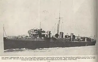On 30 August 1912 the Admiralty directed all destroyers were to be grouped into classes designated by letters based on contract speed and appearance. After 30 September 1913, as a 27-knotter, Lightning was assigned to the A class.[24][25][26]
