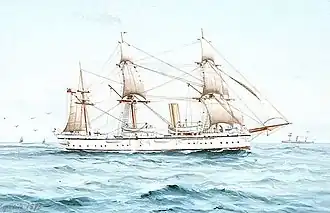 The last of six 8-gun Mariner-class gunvessels designed by Nathaniel Barnaby,[1] the Royal Navy Director of Naval Construction, her hull was of composite construction; that is, iron keel, frames, stem and stern posts with wooden planking. She was fitted with a 2-cylinder horizontal compound expansion steam engine driving a single screw, which was also built in the Malta Dockyard.[1] She was rigged with three masts, with square rig on the fore- and main-masts, making her a barque-rigged vessel. Her keel was laid at a special slipway built for her on the Senglea side of French Creek, which was still known as the "Melita Slip" into modern times.[2] Although laid down on 18 July 1883,[1] work progressed slowly; the entire enterprise had been designed to employ the local workforce when the Mediterranean Fleet was absent, and the fleet's frequent presence caused work on the new vessel to be halted all too often.[2] She was launched as Melita, the Latin name for the Malta, on 20 March 1888 by Princess Victoria Melita, the twelve-year-old daughter of the Duke of Edinburgh who was Commander-in-Chief of the British Mediterranean Fleet.[2] The Army and Navy Gazette reported that