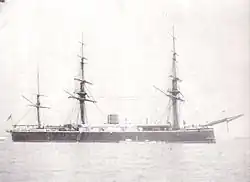 She was ordered to Malta in the Russian war scare of 1885, but broke down en route and her whereabouts were unknown for some days; she was ultimately found, towed into Malta, patched up and sent home under escort. After refit she again served in the Channel between 1885 and 1890. On 24 December 1886, she was run into in the Tagus by HMS Minotaur and was severely damaged.[5] She spent the years from 1890 to 1897 undergoing a lengthy modernisation, after which she was guardship at Simon's Bay until late 1902. Captain Charles Henry Bayly was appointed in command on 1 February 1900.[6] In March 1902 Captain Robert Kyle McAlpine was appointed in command, for service as Naval Officer in Charge Ascension.[7] Two months later, Captain William Lowther Grant was appointed in command on 5 May 1902,[8] and in July 1902 she was part of a group of seven Royal Navy ships visiting Zanzibar for a show of force following the death of the sultan and accession of his son.[9] By December 1902 she was stationed at Simon's Town, the Royal Navy base outside Cape Town.[10] She was thereafter reduced to the status of a depot ship outside Cape Town, under the new name of HMS Simoom; brought home in 1904, she was sold in 1905.