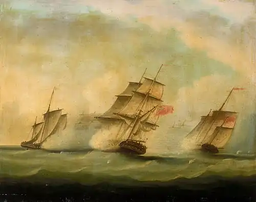 ![]() HMS Lynx and HMS Monkey capturing three Danish luggers, 12 August 1809; oil on canvas, 19th century