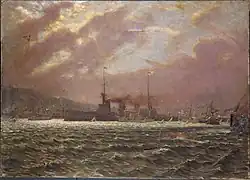 New Zealand reached Wellington in New Zealand on 12 April where over the course of her stay in the capital 98,170 citizens visited her, being conveyed out to where she was moored in the harbour by a fleet of steamers.[7][8] This was the start of an event that gripped the country as thousands of New Zealanders came to catch a sight of and where possible visit "our Dreadnought." For the ship's crew this meant having to attend a constant parade of events and festivities. The ship's detailed itinerary in New Zealand was overseen by Francis Henry Dillon Bell, Minister of Internal Affairs and acting Minister of Marine.[9] The government cable ship Tutanekai was allocated to accompany the battlecruiser around the country and transport people out to the battlecruiser if it drew too deep a draught to dock or safely anchor.[9]