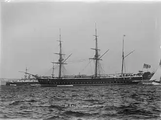 She was completed with an armament of 14 muzzle-loading 64-pounder rifled guns (2 as bow and stern chasers mounted on centre-line swivelling slides, and 12 on broadside slide mountings) and initially commenced service on the Pacific Station, and while on passage in 1876 hit a rock in the Strait of Magellan. She was damaged and repairs were undertaken at Esquimalt.[2] She returned to England in 1880 for refit, in which her broadside armament was reduced by 2 guns and she was re-rigged as a barque.[2]