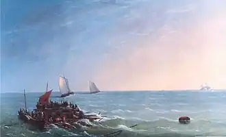 On 3 April 1813, Persian sailed for the West Indies, still under Bertram's command.[22] On 16 June she was wrecked on the Silver Cays (or Keys) Bank, just north of the island of Hispaniola, after having set out from Port-au-Prince earlier that day. The Persian ran aground while pursuing the American privateer schooner Saucy Jack, captained by John P. Chazal out of Charleston, SC. Bertram tried to lighten Persian by throwing some guns and stores overboard with the result that she floated off, only to hit another reef. Eventually, despite the crew's exertions, she broke her back and foundered. On 27 June the crew crowded into her four boats (a makeshift raft broke apart) and on 28 June they came ashore between Cabo Frances (formerly called Cap Français) and Cabo Cabron in San Domingo.[23][24] None of her crew of 126 men was lost.[22][25] However, 11 seamen took advantage of the opportunity to desert the Navy.[26]