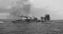 In November 1940 Force H covered the small aircraft carrier HMS Argus as she flew off Hurricane fighters bound for Malta from a position south of Sardinia. Later that month Force H participated in the inconclusive Battle of Cape Spartivento. Renown bombarded Genoa on 9 February 1941 with little effect. Force H escorted convoys both inside and outside the Mediterranean in March–May 1941 before being summoned into the Atlantic to search for the German battleship Bismarck. The ship intercepted the German supply ship Gonzenheim, which had been intended to supply Bismarck, on 4 June. Renown and Force H escorted another convoy to Malta in July and the ship returned home for repairs to her starboard bulge the next month.[34] While the exact dates are not known, the ship received a variety of radars in 1941, possibly during this refit. These included Type 284 radar for surface gunnery control, Type 285 anti-aircraft gunnery radar, Type 281 air warning radar and a Type 271 surface search radar. Two quadruple "pom-pom" mounts were also fitted on top of 'B' turret.[35] Renown was transferred to the Home Fleet in November when her repairs were complete and became deputy fleet flagship when Duke of York was detached to take Winston Churchill to the Arcadia Conference in Washington, D.C., on 9 December. She provided cover for the inbound and outbound convoys to the Soviet Union in early March 1942. Renown was relieved as flagship by Duke of York on 3 April, but became flagship of Force W which was formed to escort carriers carrying fighters to be flown-off for Malta in April–May. Renown rejoined Home Fleet once those missions were completed, but was transferred to Force H in October 1942 to participate in Operation Torch. She covered the invasion and follow-up convoys against interference by the French or Italian fleets.[34]