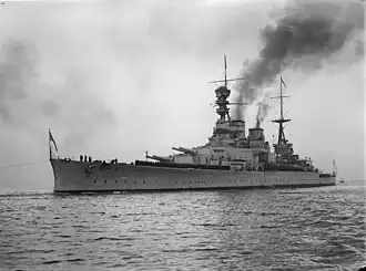 The ship's 15-inch gun turrets were modified to the Mark I (N) standard with their elevation increased to 30°. Twenty dual-purpose QF 4.5-inch Mark III guns in twin BD Mark II mountings replaced all of the 4-inch guns. Six of the gun turrets, three on each side, were abreast the forward funnel while the remaining four were mounted abreast the main mast.[23] The BD Mark II mounts had elevation limits of −5° to +80°. The Mark III gun fired a 55-pound (25 kg) high explosive shell at a new gun muzzle velocity of 2,457 ft/s (749 m/s).[28] Its rate of fire was 12 rounds per minute. They had a maximum effective ceiling of 41,000 ft (12,000 m).[29] The guns were controlled by four dual-purpose Mark IV directors, two mounted on the rear of the bridge structure and the remaining two on the aft superstructure. They fed tracking data to a HACS Mark IV analog computer for high-angle targets and an Admiralty Fire Control Clock Mark VII for low-angle targets.[23] Each gun was provided with 400 rounds of ammunition.[30] Three octuple Mark VI 2-pounder mounts were fitted, two on a platform between the funnels and the third at the rear of the aft superstructure. Each was provided with a Mark III* director. Four quadruple Vickers .50-calibre Mark III mounts were also added, two each on the forward and rear superstructures. The submerged torpedo tubes were removed and eight above-water torpedo tubes added.[23] This reconstruction, at £3,088,008, was more than three times as expensive as her earlier reconstruction.[20]