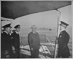 Renown was recalled in March lest the remaining German heavy ships make a final sortie and reached Rosyth on 15 April. She was given a brief refit when this concern proved illusory and was placed in reserve in May 1945. She was partially disarmed in July when six of her 4.5-inch turrets were removed preparatory to fitting these mountings with remote power control. The refit was subsequently cancelled. The ship hosted a meeting between King George VI and President Truman on 3 August when the latter was en route home aboard the heavy cruiser USS Augusta. The decision to dispose of the ship was announced on 21 January 1948 and she was towed to Faslane for scrapping on 3 August. She was the last British battlecruiser to be scrapped, outlasting Furious by a few days.[39]