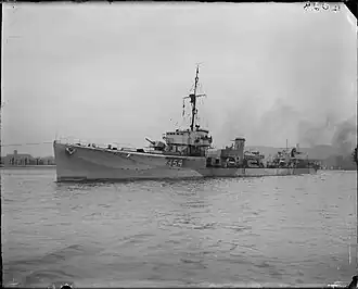 The destroyer had an overall length of 276 ft (84 m) and a length of 265 ft (81 m) between perpendiculars. Beam was 26 ft 8 in (8.13 m) and mean draught 9 ft 10 in (3.00 m). Displacement was 1,075 long tons (1,092 t) normal and 1,221 long tons (1,241 t) deep load. Three Yarrow boilers fed steam to two sets of Brown-Curtis geared steam turbines rated at 27,000 shaft horsepower (20,000 kW) and driving two shafts, giving a design speed of 36 knots (67 km/h; 41 mph) at normal loading and 32.5 knots (60.2 km/h; 37.4 mph) at deep load. Two funnels were fitted. A full load of 301 long tons (306 t) of fuel oil was carried, which gave a design range of 2,750 nautical miles (5,090 km; 3,160 mi) at 15 knots (28 km/h; 17 mph).[4]