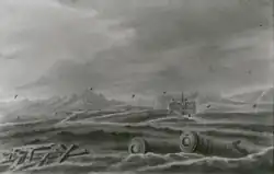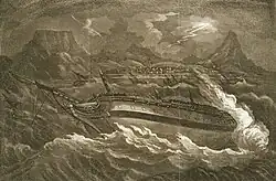 While under the command of Captain Valentine Edwards,[10][11] Sceptre was caught at anchor in a storm on 5 November 1799 along with seven other ships in Table Bay, near the Cape of Good Hope.[11] At 10:30am, the captain ordered the topmasts struck, and the fore and main yards lowered in order to ease the ship in the strengthening winds.[11] At midday, the ship fired a feu de joie on the occasion of the Gunpowder Plot, suggesting no apparent apprehension about the oncoming storm.[11] However within half an hour, the main anchor cable parted and despite the laying of a secondary one, this also broke.[11] At approximately 7pm, the ship was driven ashore onto a reef at Woodstock Beach at the site of the present-day Royal Cape Yacht Club and battered to pieces. One account states approximately 349 seamen and marines were killed or drowned. One officer, two midshipmen, 47 seamen, and one marine were saved from the wreck, but nine of these died on the beach.[12] The ship was wrecked a few hundred meters from the spot where a similar sized Danish warship, the Oldenborg was also wrecked in the same hurricane.[1]