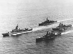 Following commissioning, Sirius joined the 24th Escort Squadron,[9] and took part in that year's Portsmouth Navy Day.[10] On 28 November 1966, Sirius set out from Portsmouth for the Far East, in order to join the Singapore-based 2nd Destroyer Squadron.[11] Early in 1967, she interrupted her passage out to Singapore to carry out a deployment on the Beira Patrol, which was designed to prevent oil reaching landlocked Rhodesia via the then Portuguese colony of Mozambique.[12] After Sirius reached her station at Singapore, the frigate took part in a number of 'fly-the-flag' visits to a variety of ports. Sirius also took part in the Coronation of Taufa'ahau Tupou IV of Tonga.[13][14] The following year, Sirius deployed to the West Indies. In 1968 she took part in Portsmouth 'Navy Days'.[15] Between 1966 and 1968 she was commanded by Derek Reffell.
