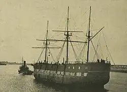 Southampton, moored on the River Humber at Hull, was established as a training ship in 1866. On 31 July 1868, the ship was officially certified as an industrial school ship, allowing it to take boys committed by magistrates. The vessel could accommodate 240 boys aged from 11 to 15.[2] On 26 November 1879, three inmates set fire to the ship. Another inmate informed the officer on watch and the fire was extinguished. Those responsible were charged with arson.[4] By the end of 1909, Southampton had trained 2,600 boys, 57 per cent of whom had gone into the Merchant Service, and 5 per cent to the Royal Navy.[2]