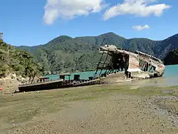 By 1919 she was in a poor state of repair,[2] and the prohibitive cost of returning her to a seaworthy condition brought an end to her seagoing life. The last cadet was discharged on 16 December 1921, and she was formally paid off in late December. She was sold to Mr E A Jory in February 1922 and dismantled at Wellington before being sold to the Westport Coal Company for use as a coal hulk. In 1940 she was sold again to the Union Steam Ship Company of New Zealand for further use as a coal hulk at Port Nicholson, and in March 1953 was sold for the last time and towed to St Omer Bay in the Kenepuru Sound, where she was used as a store hulk and jetty. Although reported broken up in 1955, her remains lie on the beach in the southern end of the bay (41°11.12′S 173°58.33′E / 41.18533°S 173.97217°E).[2]