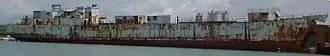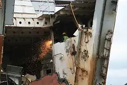 The ship was added to the Royal Navy’s scrapping list in May 1970, though continuing to serve as part of the Submarine Refit Group in Rosyth Dockyard until 2002,[4] when nuclear refitting in Rosyth ceased. She was sold to Pounds of Portsmouth in 2002, arriving there to be scrapped on 10 December 2002. She was offered for preservation between 2004 and 2005, but it was confirmed in January 2006 that she would be broken up. After further discussions with heritage and preservation groups, in 2008 her bow doors were removed[2] and she was broken up in 2010 at Pounds scrap yard, a process recorded by National Historic Ships.[5]