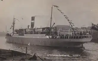 HMS Stephen Furness was a Royal Navy armed boarding steamer of the First World War. She was built as a passenger vessel for the Tyne Tees Steam Shipping Company (TTSSC) by Irvine's Shipbuilding & Drydock Company of West Hartlepool. She was named after TTSSC chairman Sir Stephen Furness, 1st Baronet and launched in 1910. She served on the Newcastle–London route until the First World War when she was acquired by the navy. She served on the route to Murmansk, Russia, but was sunk by a U-boat in 1917 while traversing the North Channel 10 miles east of the entrance to Strangford Lough, Northern Ireland.[1] More than 100 men died in her sinking.