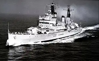 Rear-Admiral Michael Pollock flew his flag in her as Flag Officer, Second-in-Command, Home Fleet, from 1965 to 1966. On 10 August 1966 one of the guns accidentally fired a practice shell into Devonport Dockyard during material tests of the equipment. "One member of the ship's company was slightly grazed, but there were no other casualties."[24] In October 1966, the ship was visiting Cardiff at the time of the Aberfan disaster. The crew assisted with the rescue and recovery operation.[25]