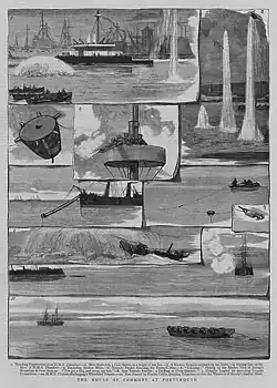 Vesuvius was not seriously evaluated against her design role of night torpedo attacks and was too slow and had too short a range to accompany the fleet. She was relegated to experimental and training roles, attached to HMS Vernon, the Royal Navy's torpedo training school.[9][13] In 1886–1887, Vesuvius took part in a series of trials to test anti-torpedo nets, firing torpedoes against the old ironclad Resistance. The conclusion of the tests were that anti-torpedo nets were an effective protection against torpedoes.[14]