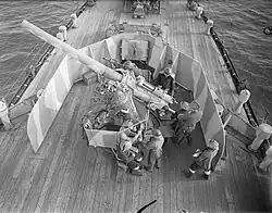 The repeat Shorehams were modified in 1937 to 1939 to improve their anti-aircraft capability, with Weston having a major refit in 1939, with the aft 4-inch gun being replaced by a second HA gun, and a quadruple Vickers .50 machine gun mount added for close-in anti-aircraft duties. In September 1939, a second quadruple machine gun mount was added.[8] The ship's armament continued to be modified through the war, with the 3-pounder guns and the multiple machine guns removed, and first two, and later another two single Oerlikon 20 mm autocannon added.[5][6] The ship's anti-submarine armament was also gradually increased during the war, with the number of depth charges carried increasing from 15 to as many as 60–90.[9][6] Other wartime changes included the fitting of radar and High-frequency direction finding gear.[5]