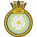 HMS York was a Batch III Type 42 destroyer of the Royal Navy. Launched on 20 June 1982 at Wallsend,[4] Tyne and Wear and sponsored by Lady Gosling, York was the last Type 42 ordered. The ship's crest was the White Rose of York, and the "red cross with lions passant" funnel badge was derived from the coat of arms of the City of York. With a maximum speed of 34 knots (63 km/h; 39 mph), she was the Royal Navy's fastest destroyer.[3]