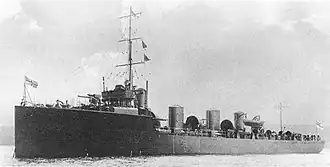 Gun armament consisted of two 4-inch (102 mm) guns,[a] with two 18-inch (460 mm) torpedo tubes comprising the ship's torpedo armament.[8] The ship had a complement of 71.[6]