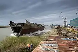 The first steel was cut in a ceremony on 2 December 2020 at the Damen yard in Galați.[29] On 2 June Damen Shipyards Galați has performed the keel-laying ceremony on the Combat Support Ship (CSS) Den Helder.[30] The keel-laying ceremony was performed by the Director Defence Material Organisation (DMO), vice admiral Arie Jan de Waard and vice admiral Rob Kramer, Commander Royal Netherlands Navy (RNLN).[31] The ship was formally laid down on 2 June 2021.[32] The first major section, measuring 90 m (300 ft), of the new vessel was launched in Galați on 11 April 2022.[33] The assembled ship was floated and moved to another part of the building dock in October 2022 with work expected to continue through 2023. Sea trials are anticipated in early 2024.[34][35]