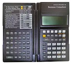 The HP-18C is a Hewlett-Packard business calculator which was quickly followed by the very similar but greatly improved HP-19B. The HP-18C is HP's first RPL-based calculator internally,[1] even though this was not visible on user-level in this non user-programmable model. The user has a solver (another HP first) available, but only had about 1.5 KB of continuous memory available to store equations.