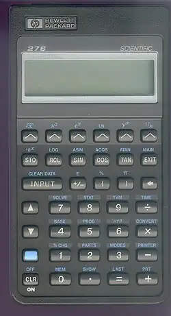 The HP-27S was a pocket calculator produced by Hewlett-Packard, introduced in 1988, and discontinued between 1990 and 1993 (sources vary). It was the first HP scientific calculator to use algebraic entry instead of RPN, and though it was labelled scientific, it also included features associated with specialized business calculators.