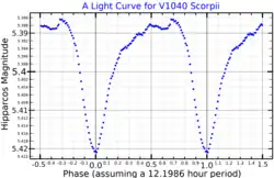 ![]() A light curve for V1040 Scorpii, adapted from Grunhut et al. (2012).[1] The data is from MOST but has been shifted to match the Hipparcos magnitude scale. | |
