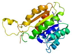17-β-Hydroxysteroid dehydrogenase X (HSD10) also known as 3-hydroxyacyl-CoA dehydrogenase type-2 is a mitochondrial enzyme that in humans is encoded by the HSD17B10 (hydroxysteroid (17β) dehydrogenase 10) gene.[5][6][7][8][9] Several alternatively spliced transcript variants have been identified, but the full-length nature of only two transcript variants has been determined.[10] Human HSD10 cDNA was cloned from the brain (NM_004493), and the resulting protein, a homotetramer, was first characterized as a short chain 3-hydroxyacyl-CoA dehydrogenase (SCHAD).[11] Active sites of this enzyme can accommodate different substrates; 17β-HSD10 is involved in the oxidation of isoleucine, branched-chain fatty acids, and xenobiotics as well as the metabolism of sex hormones and neuroactive steroids.[12][13]