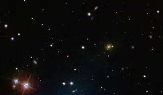 HS 0810+2554 is a quadruply imaged lensed quasar. When imaged, the lens of the object is found separated into four components made up of two close paired bright images labeled A and B described as merging, and two other faint images labeled as C and D.[3] When imaged using infrared imaging at high resolution, the A and B components displayed flux ratio trends which ranged from 1.79 to 1.23 at wavelengths and in micrometer range from 2.16 right up to 4.78. The time-delay for both components has been estimated as 0.05 days via a free-form lens modelling software, making it the shortest detected.[7] The lens galaxy of HS 0810+2554 is located at an unknown redshift although A.M. Mosquera and C.S. Kochanek calculated the redshift as 0.89.[7][8]