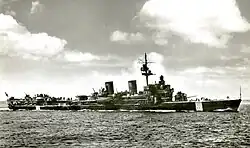 Gotland continued to serve with the Coastal Fleet conducting neutrality patrols during the war while also continuing to train cadets.[6][15] When the Germans invaded Norway and Denmark (Operation Weserübung) on 9 April 1940, the ship was being overhauled in the Naval Shipyard in Stockholm.[20] In May 1941 one of Gotland's Ospreys sighted the German battleship Bismarck and the heavy cruiser Prinz Eugen during a gunnery training exercise when they broke out of the Kattegat between Denmark and Norway. The sighting was reported to Royal Swedish Navy headquarters. The report was leaked to the British naval attaché in Stockholm, who forwarded it to the British Admiralty, triggering the Battle of the Denmark Strait and the pursuit of the battleship.[21] From late 1943 to April 1944, Gotland was converted into an anti-aircraft cruiser.[22]