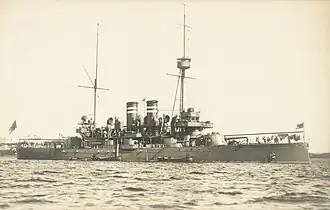 The ship served during the First World War protecting the nation's trade routes and shipping fleet due to Sweden's neutrality in the war.[12] In 1924, the vessel was withdrawn from front-line service, a noteworthy short life compared to the remainder of the class. On 15 March 1940, Wasa was taken out of service. The ship's armour was removed and the vessel was reconfigured to act as a double to the newer Drottning Victoria to confuse enemy reconnaissance aircraft.[7] Some of the material removed was used in the construction of the cruisers Göta Lejon and Tre Kronor.[13] The ship found a new role as a training vessel and, in 1952, joined the Berga Naval School to train sailors in damage control.[14] On 9 November 1960, Wasa was sold to Marinverkstaderna to be broken up at Karlskrona.[7]