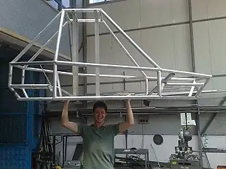 HU-GO has a very light (24 kg) space frame chassis made of aluminum tubes. The body, which is mounted on the chassis is made of fiberglass. Windscreen and wheel covers are made from Plexiglas. All of the components are designed (or selected) within a narrow range of safety factors to keep the weight low. As a result, HU-GO has a competitive weight of only 257 kg in total.[2] While reducing the weight, rollover and torsional stiffness calculations have done by using finite elements method software for safety, and successful simulation results were obtained.