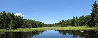 The terrain consists of low rolling hills with many beaver meadows and swamps. Although the area is forest-covered, extensive forest fire damage in the southern half has resulted in much of it now being covered with brush, pin cherry, aspen and bracken fern.
