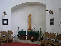 Built in 1260, the church belongs to the transition period from Romanesque to Gothic architecture. The first is characterized by the plant ornament of the capital of the pilasters and the second by three star (asteroid) vaults. The portal was also originally Romanesque – the wimperg on the round arch had a niche with the figure of the patron saint. The inner walls were covered with paintings, the floor consisting of the gravestones of clergymen and distinguished noblemen. A unique round baptismal chapel was built in the second half of the 14th century.[3]