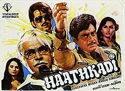 Haathkadi (transl. Handcuffs) is a 1982 Indian Hindi-language film directed by Surendra Mohan, starring Sanjeev Kumar, Shatrughan Sinha, Reena Roy and Ranjeeta in pivotal role. This film contains songs composed by Bappi Lahiri.
