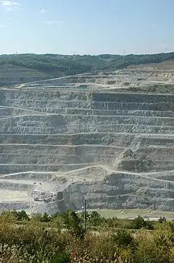 The mine is the lowest point in Japan at 170 metres (560 ft) below sea level,[1] and digging still continues. The open pit has a north–south length of approximately 2 kilometers and an east–west width of 800 meters. The limestone excavated is transported by a 10 kilometer pipeline with belt conveyor to Port of Hachinohe.