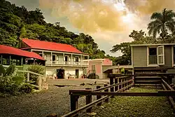 The manor house is a 2-story 60x50ft building. It was built in 1845. The ground floor was designed to be used for storage. The second floor contains three bedrooms and a living room. The eastern half of the manor house is made of brick and includes a courtyard, the kitchen, two more bedrooms and a bathroom. The manor house also has garden surrounded by a wrought iron-and-brick fence. The garden served two purposes: "Historically, this garden served as the formal entrance to the hacienda complex; however, it was most often used as a private family place."[21] Dependent on horses for managing the hacienda, its administrators also built a carriage house, stables, and a small caretaker's house.[22] In addition mule stables and caretaker's office were also built.[23] Located opposite the manor house, is the hurricane shelter. It is a solid brick structure measuring 15 ft (4.6 m). x 25 ft (7.6 m), and built 3 ft (0.91 m). above ground. Its walls, floor and ceiling were made to withstand or dissipate the destructive tropical storms that are common in this region.[23]