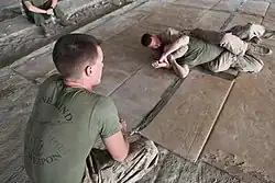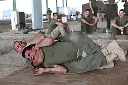 The choke has two variations:[1] in one version, the attacker's arm encircles the opponent's neck and then grabs their biceps/shoulder on the other arm (see below for details); in the second version, the attacker clasps their hands together instead after encircling the opponent's neck.[2] Recent studies have shown that the rear-naked choke takes an average of 8.9 seconds to render an opponent unconscious, regardless of the grip that is used.[3]