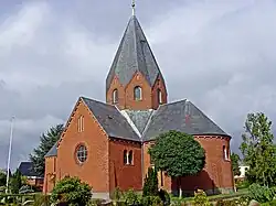 The church was built in 1898 and designed by the architect Claudius August Wiinholt from Viborg. At the time, the church's construction cost 23,000 krones. An additional 2,000 krones were spent for the construction of a chapel, where the church bell was originally hung.[1] The church's floor plan resembles a greek cross, where each wing is of equal length. In 1967, the church underwent major renovations and the western wing was extended by two meters. The interior of the church was originally constructed with red brick walls, which have since been painted white.