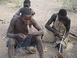 The Hadza are not closely related to any other people. The Hadza language was once classified with the Khoisan languages because it has click consonants; however, there is no further evidence they are related. Genetically, the Hadza do not appear to be closely related to Khoisan speakers; even the Sandawe, who live around 150 kilometres (93 mi) away, diverged from the Hadza more than 15,000 years ago. Genetic testing also suggests significant admixture has occurred between the Hadza and Bantu. Minor admixture with Nilotic and Cushitic-speaking populations may have occurred in the last few thousand years.[2] Today, a few Hadza women marry into neighbouring groups such as the Bantu Isanzu and the Nilotic Datooga, but these marriages often fail, and the women and their children return to the Hadza.[14] In previous decades, rape and capture of Hadza women by outsiders seems to have been common.[15] During a famine in 1918–20, some Hadza men were reported as taking Isanzu wives.[14]