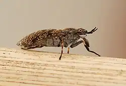 Haematopota is a genus of flies in the horse-fly family, Tabanidae.[4] Among the horse-flies, they are most commonly known as clegs. Many species have colorful, sinuously patterned eyes in life, a character that fades after death. The wings are typically patterned with spots of grey.[5] The genus is named from the Ancient Greek for blood-drinker: αἷμα, haîma, blood; πότης, pótës, drinker.[6] Some species are known to be vectors of livestock diseases.[7]