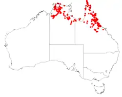 Found in the Top End of the Northern Territory,[2][6][7] Northern Queensland[2][6][7] and Papua New Guinea.[7] Occurs in open woodland habitats on gravelly or shallow lateritic soils and sandstone.[6]