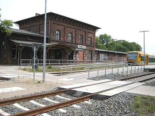 Hagenow Stadt station is a station the German state of Mecklenburg-Vorpommern on the Hagenow Land–Bad Oldesloe railway, which is now largely disused or dismantled to the northwest of the station. It is located in the centre of Hagenow and was built in 1894[2] with the name of Hagenow, but it has been listed in the official timetables as Hagenow Stadt (town) since 2010. It consists of a small entrance building with catering facilities and, attached on its southern side, there is a long shed that used to serve freight operations. The main platform and another island platform are located on the two-track line. The entrance building is on the side of the line that faces towards the centre of town. Between Hagenow Stadt station and the point where the line towards Hagenow Land station becomes a single track, the tracks spread at two locations with four or five parallel sidings at each place, but they are no longer used. The entrance building and the freight terminal buildings are heritage-listed monuments.[3]