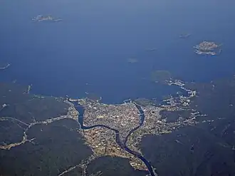 Facing the Sea of Japan on one side and being surrounded by mountains on three sides, the center of Hagi is located on one of the largest delta areas in Japan. The Abu River splits into two, forming the Hashimoto River and the Matsumoto River. Outlying islands include Mishima, Oshima, Aishima, Hitsushima, Hashima, Hisima, and Oshima. of which Ainoshima and Hitsushima are inhabited.