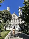 The property where the Church stands used to be the site of a Greek Orthodox cemetery and hospital.[6] This was demolished in order to build the Church. Its construction, based on the designs of the Ottoman Greek architect P. Kampanaki, began on 13 August 1876 and was completed on 14 September 1880.[2][7][8] The Church is built in neo-baroque style with elements of a basilica,[9] and with the unusual features of twin bell towers, a large dome and a neo-Gothic facade.[2] The Hagia Triada was the first domed Christian church that was allowed to be built in Istanbul after the Fall of Constantinople in 1453.[9]