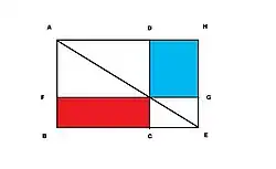 Liu Hui used his rectangle in right angle triangle theorem as the mathematical basis for survey. The setup is pictured on the right. By invoking his "in-out-complement" principle, he proved that the area of two inscribed rectangles in the two complementary right angle triangles have equal area, thus
