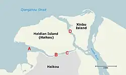 Haidian Island (simplified Chinese: 海甸岛; traditional Chinese: 海甸島; pinyin: Hǎidiàn Dǎo) is an island that forms part of the city of Haikou, Hainan Province, China.[1] It is separated from the main part of Haikou by the Haidian River. The north coast faces the Qiongzhou Strait. The east coast faces Xinbu Island, separated by part of the Nandu River. The west coast faces Haikou Bay.