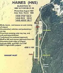Haines Airport (IATA: HNS, ICAO: PAHN, FAA LID: HNS) is a state-owned public-use airport located three nautical miles (6 km) west of the central business district of Haines,[1] a city in the Haines Borough in the U.S. state of Alaska. It is the primary airport serving the Haines, Klukwan, Haines Borough area and is situated on the Haines Highway, directly adjacent to the Chilkat River.