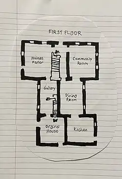 Behind the Community Room is the dining room. This room is known for its multiple doors to let air during the summer. It is believed the room originally served as a work or sewing room. It is currently used to house exhibits. Connected to the dining room is the new kitchen that was originally the back porch. It was enclosed in 1910 when the home was divided into apartments. Connected to and across from the new kitchen is the original home or old kitchen. This section of the home was the first piece of the one-room home. It houses a loft for sleeping. In the original home the only piece of furniture that was owned by the Haines family is housed. In Between the main parlor and the original house is the Gallery.[3]