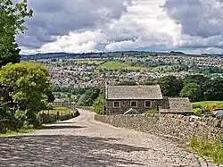 The road just past Hainworth became the main thoroughfare that was used between Keighley and Halifax (via Cullingworth), and allowed for the growth of the cloth and wool industries in the hamlet, as it connected to the Piece Hall in Halifax.[6] Those who lived in Hainworth were employed mostly in agriculture and the worsted industries until the Industrial Revolution prompted many mills to be built in the Worth Valley as Hainworth did not have access to fast flowing water for power.[7] The proximity of mills to the River Worth led to the Keighley to Halifax Turnpike being built in 1752, away from Hainworth on the floor of the Worth Valley.[8] However, much of the cloth made in the valley was still woven in Hainworth, which necessitated the construction of Hainworth Lane down to Ingrow. As Hainworth Lane is built on a steep gradient, it needed to be wide and have a good surface, so it was setted. The road still has patches of stone setts (cobbles) in between tarmac to this day.[9] The steep road and the cobbles are seen as a challenge to push bikers,[10][11] and the road is part if the Calder/Aire Bridleway link.[12]